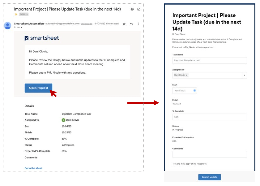 The screenshot below gives you a sneak peek into the email/notification your end user will receive. By following the prompts within the email, they will be able to provide critical updates without logging into Smartsheet. Updates collected will automatically – and immediately – be captured within your source Sheet.